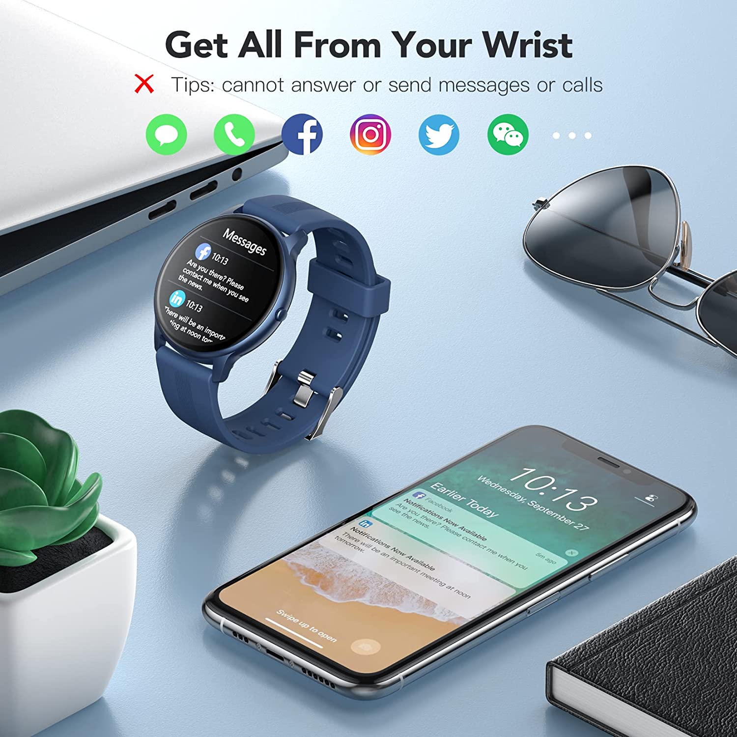 - Your Personal Smart Assistant Activity tracker (pedometer, calories, distance), heart rate, various sport modes, sleep monitoring.,etc. Get notifications of Call, SMS, and APP messages(THE WATCH CAN NOT MAKE MESSAGES, CALLS or TEXT BACK, Bluetooth distance 8-10 meters), remote control of music and cameras, weather report, sedentary reminder, alarm clock, stopwatch, find phone, call rejection, brightness adjustment, power-saving mode, and other functions to meet your daily needs.