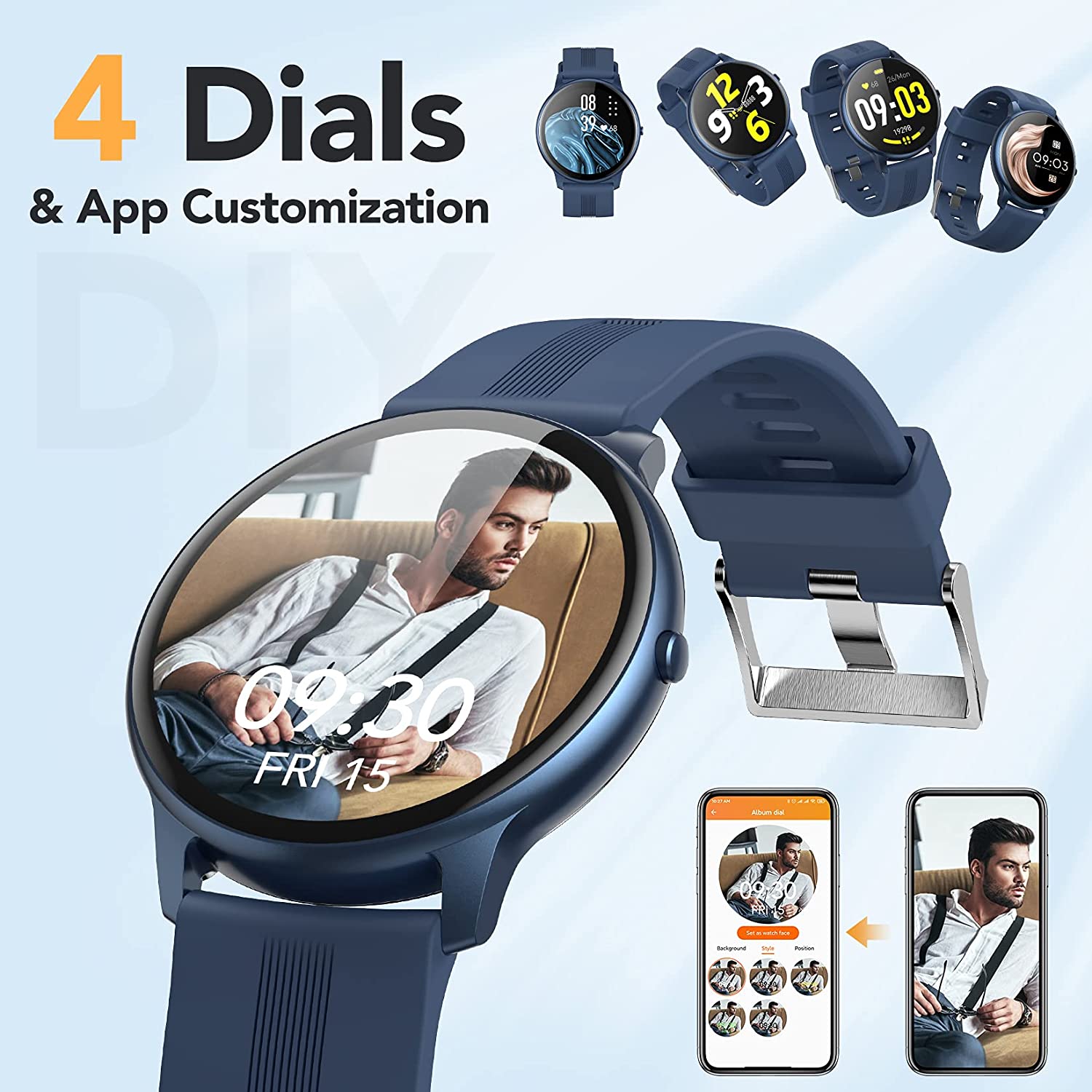 - Your Watch, Your Style 1.3/33mm touch screen covered with an aluminum alloy frame, so elegant and light to wear, but sturdy and anti-scratch. The smart watch contains 5 dials readily available to choose from along with another 30 more dials within the app. You can also customize your watch faces. It can be any photo, such as your family, pet ,etc. NOTE: When there is a software update prompt on the APP, it is recommended to upgrade to the latest software version for a better experience!